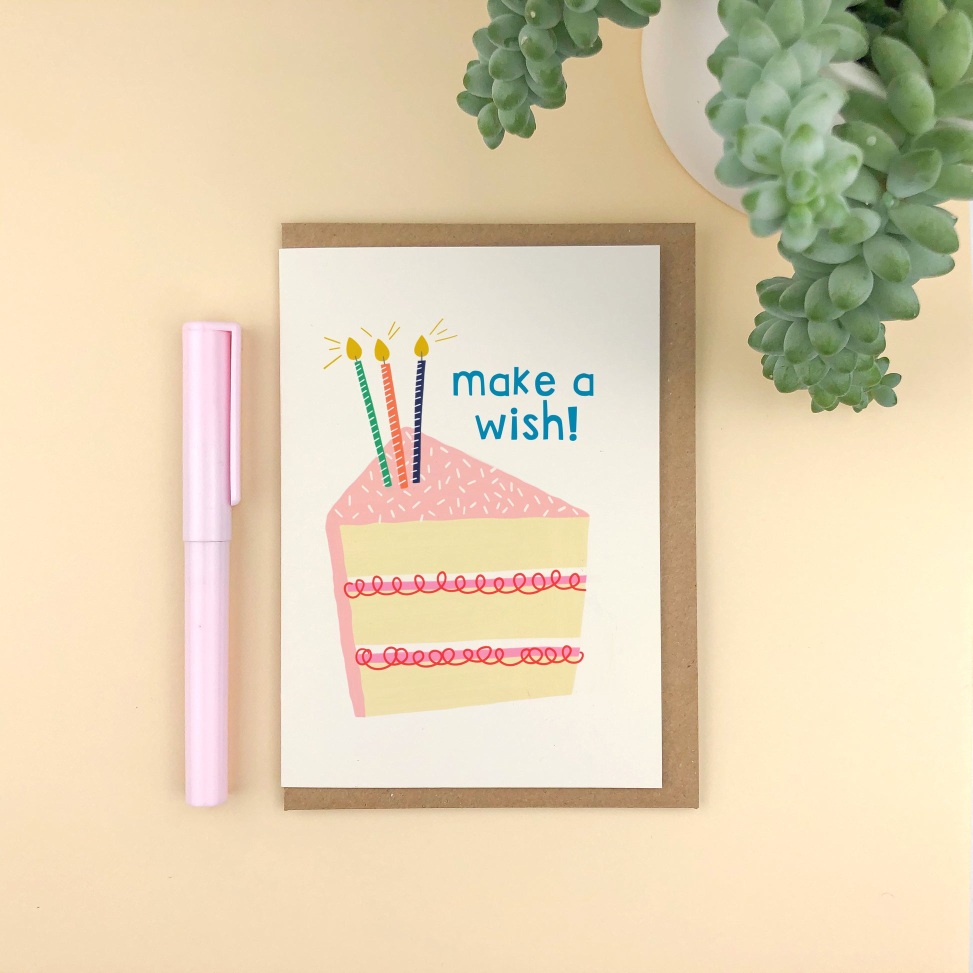 Send your best birthday wishes with this fun and cute 'Make a Wish!' birthday card. Illustrated cake slice with candles and birthday text makes this a great birthday all-rounder.